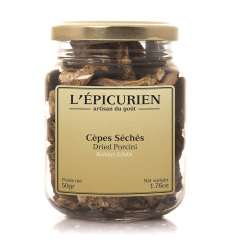 Champignons séchés l'Épicurien - 50g. Réhydratez vos champignons 1 à 2 heures dans de l’eau tiède. Rincez abondamment puis utilisez comme des champignons frais : dans des tagliatelles, des viandes en sauce, des tourtes, omelettes, poêlées ou fricassées. Cèpes séchés. Girolles séchées. Mélange forestier (bolets jaunes 40%, pleurotes 30%, champignons noirs 20%, cèpes 10%).