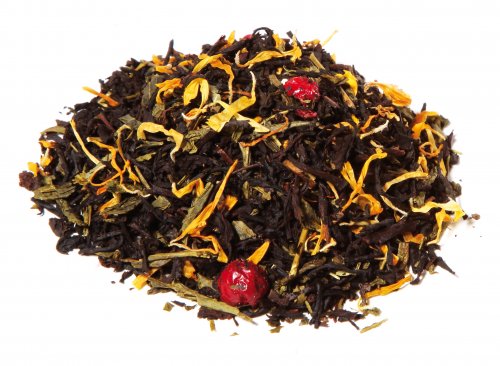 L’île aux trésors : Saveur mangue-papaye Ingrédients : Thé noir Assam, -Inde du Sud, thé vert de Chine Sencha, arôme naturel, morceaux de mangue, papaye, fleurs de souci, canneberge.