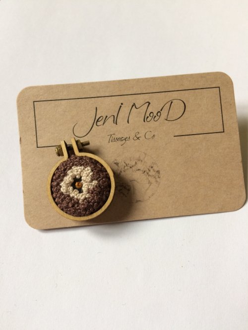 Je m’amuse aussi à la broderie, avec mon point de nœud fétiche, qui permet de donner du relief et une texture particulière à mes créations murales colorées, mes bijoux et broches brodés.